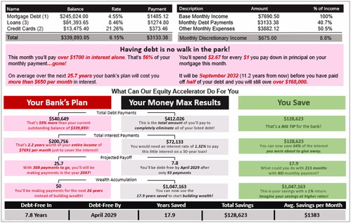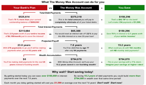 This Client will be debt free in 7.8 years instead of 23 years using his Money Max Account !!!